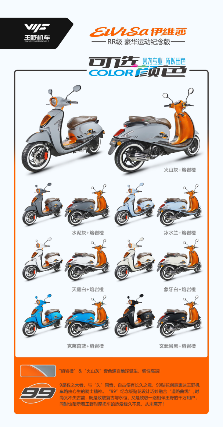 王野,创建于 1999 年,是国家摩托车、电动摩托车一级生产资质企业,是浙江省踏板式摩托车发动机制造龙头企业,浙江省踏板式摩托车重点生产企业,浙江省踏板摩托车出口领导品牌。公司集摩托车、发动机研发、生产和销售于一体。公司拥有配置精良的发动机装配流水线、整车装配流水线和整车塑件涂装烤漆生产线;设有应用三座标检测CAD/CAM 计算机辅助设计的发动机研究室、整车技术研发中心、具有各型号发动机的测功机、摩托车底盘测功机和工况法排放检测系列的检测室,形成了设施先进、流程完整的研发、检测系统,同时也是浙江省内唯一一家拥有外场试验场地的摩托车企业,能满足摩托车制动性能试验、最高车速及加速性能测试、噪声等测试。